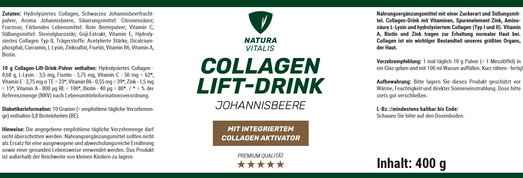 - 10 Gramm Collagen-Lift-Drink Pulver von NATURA VITALIS enthalten: Hydrolysiertes Collagen - 8,68 g, L-Lysin - 3,5 mg, Fisetin - 3,75 mg, Vitamin C - 50 mg = 62*, Vitamin E - 2,75 mg -TE = 23*, Vitamin B6 - 0,55 mg = 39*, Zink - 1,5 mg = 15*, Vitamin A - 800 μg RE = 100*, Biotin - 40 μg = 80*.