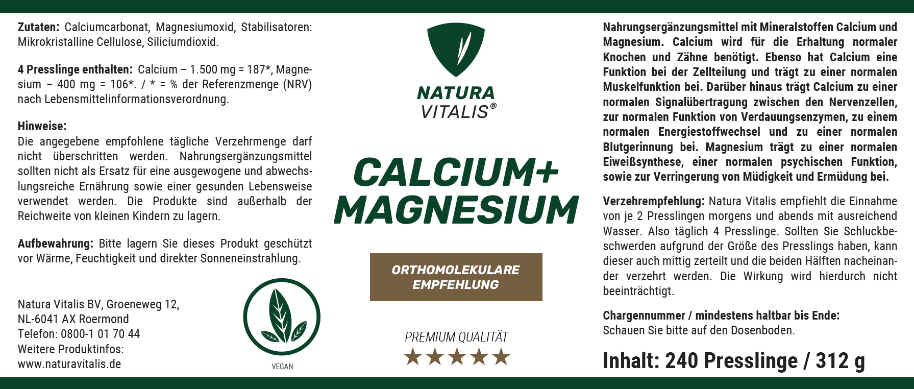 NATURA VITALIS Calcium + Magnesium - HOCHDOSIERT - 240 Presslinge