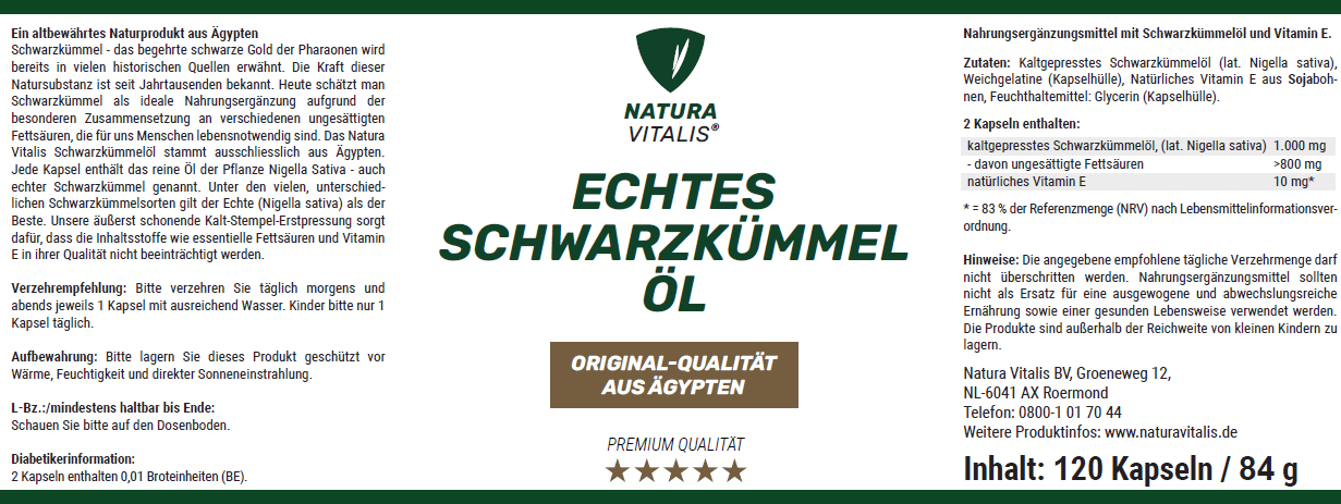 - 2 Softgels Schwarzkümmelöl von Natura Vitalis enthalten: Kaltgepresstes Schwarzkümmelöl (lat. Nigella sativa) - 1.000 mg und Vitamin E - 10 mg*.