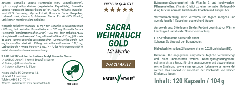 - 2 Kapseln Sacra Weihrauch Gold von NATURA VITALIS enthalten: Vitamin C - 40 mg = 50*, Boswellia Serrata Harzextrakt - 800 mg, darin enthalten Boswelliasäuren – 520 mg, Boswellia Serrata Harzextrakt (standardisiert auf 5% AKBA) – 200 mg - darin enthalten AKBA (Acetyl-Keto-Boswelliasäure) - 10 mg, α-Boswellia-Säure - 115 mg, β-Boswellia- Säure - 180 mg, Boswellia Sacra Harzpulver - 100 mg, Myrrhe Extrakt - 120 mg, Kurkuma Wurzelextrakt – 150 mg, darin enthalten Curcumin – 142,5 mg, Lorbeer-Extrakt – 40 mg, Piperin – 2 mg.