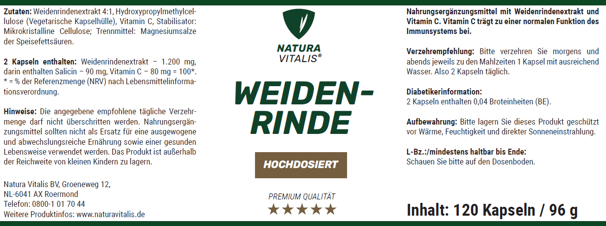 Mit dem Produkt „Weidenrinde“ hat Natura Vitalis daher ein Nahrungsergänzungsmittel kreiert, durch das Ihnen die Möglichkeit gegeben wird, die spannenden ernährungsphysiologischen Wirkungen zur Unterstützung des allgemeinen physiologischen Wohlgefühls zu genießen. Als Lebensmittel verfügt zwar unser Produkt infolge seiner entsprechend niedrigeren Dosierung nicht über die analgetischen Wirkungen eines Schmerzmittels. Gleichwohl kann gerade bei intensiven Belastungen des Alltags der in unserem Produkt enthaltene Weidenrindenextrakt ein Labsal für Ihr allgemeines physiologisches Wohlbefinden sein.