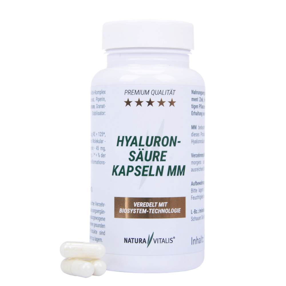 - Inhaltsstoffe (Hyaluronsäure MM): 2 Kapseln Hyaluronsäure MM von Natura Vitalis enthalten: Vitamin A - 1000µg= 125*, Zink - 7,8mg = 78*, Hyaluronsäure Mikro Molekular - 100mg, Immunglobuline - 52mg, Chrysin - 45mg, Piperin - 4mg, Granatapfelmehl - 200mg* = % der empfohlenen Tagesverzehrmenge nach Lebensmittelinformationsverordnung.