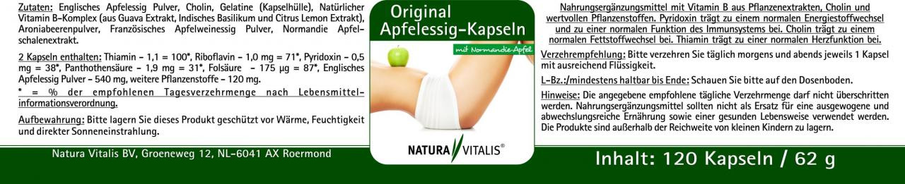 2 Kapseln enthalten: Cholin – 83 mg, Thiamin - 1,1 = 100*, Riboflavin - 1,0 mg = 71*, Pyridoxin - 0,5 mg = 38*, Panthothensäure - 1,9 mg = 31*, Folsäure - 175 μg = 87*, Englisches Apfelessig Pulver - 540 mg, weitere Pflanzenstoffe - 120 mg.