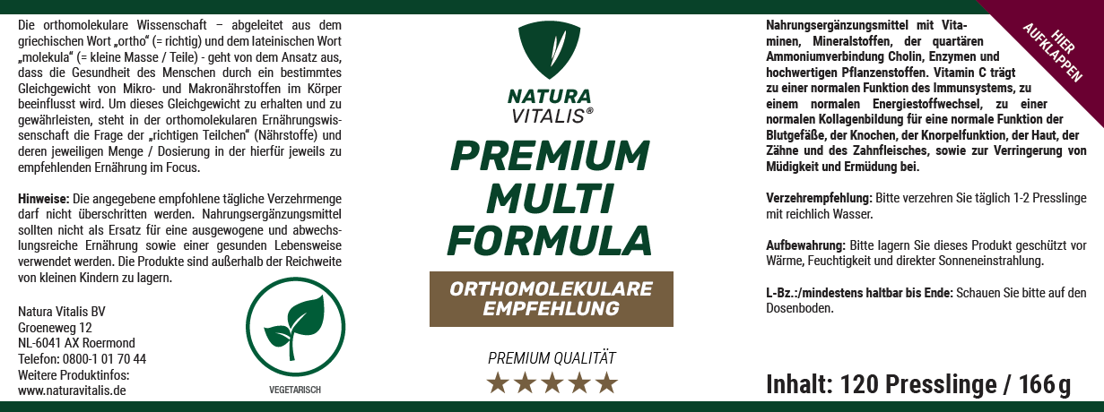 NATURA VITALIS Premium Multi Formula ist auch nicht nur ein Multivitaminprodukt. Es ist ein einzigartiges Multivitalstoffprodukt mit so dermaßen vielen verschiedenen, lebenswichtigen Vitaminen, Mineralien, Spurenelementen, Enzymen, Carotinoiden, Bioflavonoiden und Kräutern, dass wir erstmalig ein gefaltetes Leporello-Etikett verwenden mussten, um die umfangreiche Super-Nährstoff-Rezeptur überhaupt korrekt aufführen zu können. Auf einem normalen Etikett reichte einfach nicht der Platz, für das riesige Füllhorn an hochwirksamen Biostoffen, aus.