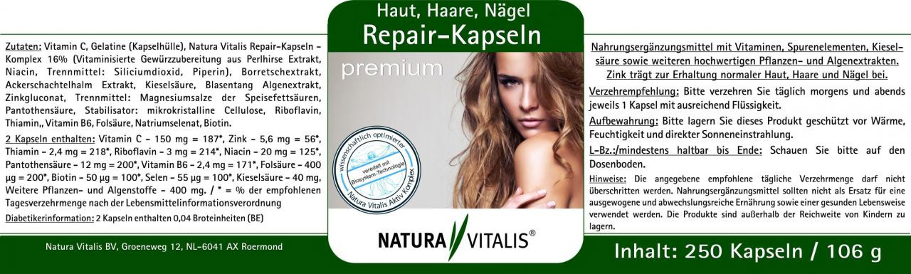 Repair-Kapseln Premium von NATURA VITALIS mit Vitaminen, Spurenelementen, Kieselsäure sowie weiteren hochwertigen Pflanzen- und Algenextrakten unterstützen aktiv die natürliche Regeneration von Fingernägeln, Haut und Haaren. Vollgepackt mit den besten "Schönheitssubstanzen" von Mutter Natur - denn echte Schönheit kommt im wahrsten Sinne des Wortes von innen!